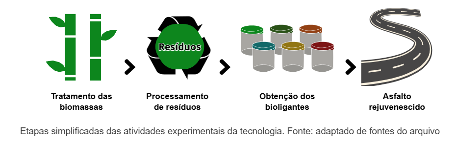 O ligante asfáltico tradicional é derivado do petróleo, e esse material perde suas propriedades conforme é exposto ao tráfego e ao clima, exigindo manutenção e substituição. A presente tecnologia surge como uma alternativa aos ligantes asfálticos de petróleo, apresentando bioligantes produzidos a partir de resíduos agrícolas como bagaço de cana-de-açúcar e casca de arroz, que são abundantes em nossa cadeia de produção.